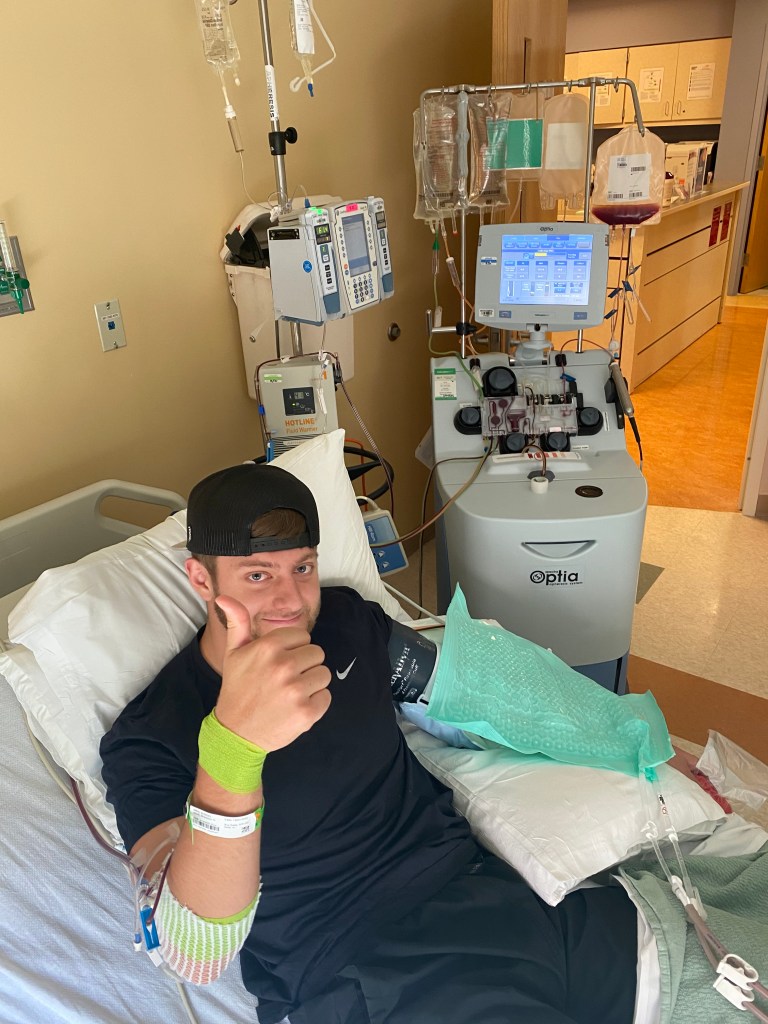 Braydo’s stem cells were collected on Monday, September 21, 2020. For five days prior to collection date, he had to give himself three shots a day in his stomach. The shots caused his bone marrow to create an excess amount of stem cells for collection. He said the shots hurt… but also I had to do two shots a day for 14 days when I did the egg retrieval process so I told him to suck it up buttercup. The day of collection, he had a mini hospital room to himself. He was able to order food from the kitchen whenever he wanted but the kicker was he couldn’t move either of his arms. Both arms had large IV needles in them. One arm had the big machine in the room sucking out his blood, the big machine would separate the stem cells from the rest of the blood, and the other arm had all the excess “stuff” pushed back into his body. So where does that leave me? I fed baby Braydo his food while he sat back in his bed watching TV like a King. It’s like he’s saving my life or something? At the end of the day, they needed to collect 8.7 million stem cells. Brayden was able to donate 12 million stem cells. It’s like he’s a Blick or something… over achiever to the core.