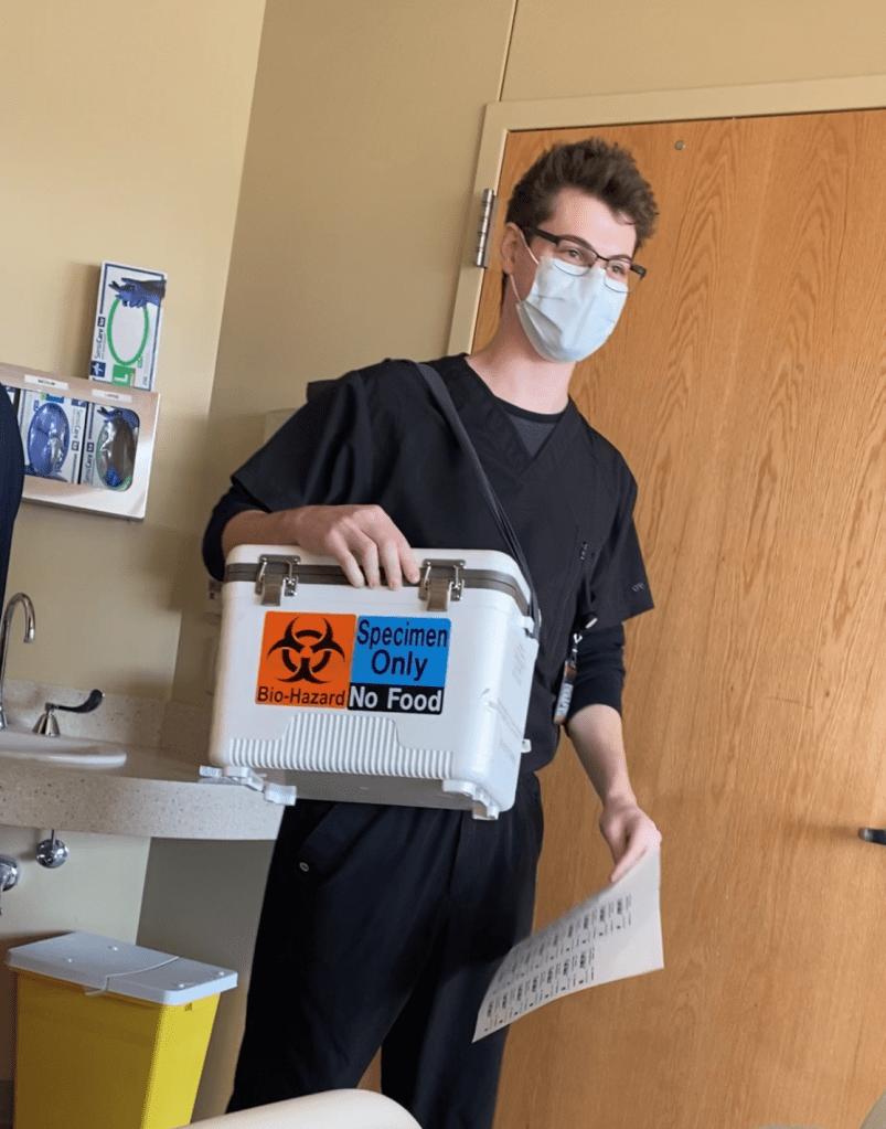 Today is cells day! Happy second birthday to me! My nurses helped Aaron decorate my room this morning which helped bring some much needed light to the dull hospital room. The cutest humans in the world. I appreciate the nurses and Aaron so much for making it feel like a “birthday.” The nurses even brought me a Bundt cake (delicious). It was overall very uneventful which is not what people initially expect. I lay in bed, am hooked up to a million different heart rate monitors and am dosed up with loads of Benadryl and Tylenol (I know the one and ONLY time they give me Tylenol). Both cords were delivered by a guy with a cooler just like in Grey’s Anatomy… I’m not kidding.